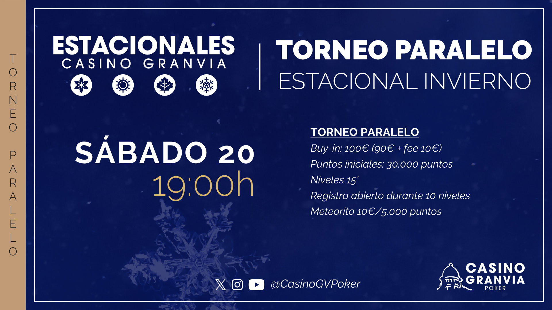 Hora de inicio: 19:00 Buy in: 100€ (90€ + fee 10€) Puntos iniciales: 30.000 Niveles: 20' Registro extendido: 10 niveles Meteorito: 5K | 10€ Si usted no puede asistir al torneo adquirido a través de la WEB, tras realizar las comprobaciones oportunas se le devolverá el importe de la compra en un plazo máximo de 30 días.… Leer más »Torneo Paralelo Estacional de Invierno