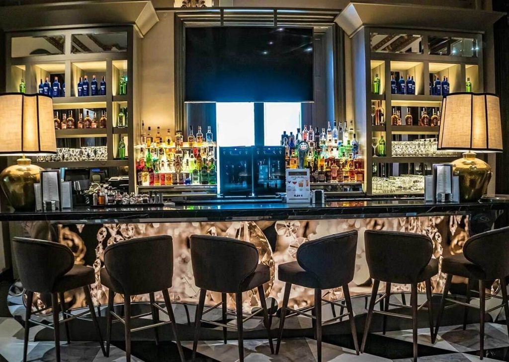 La coctelería del casino está situada junto al Salón Real y tiene todo el ADN del edificio: una estantería espectacular, detalles Art Déco que no son decoración añadida sino parte de la arquitectura original, y un ambiente que no imita a nada porque ya es un original.