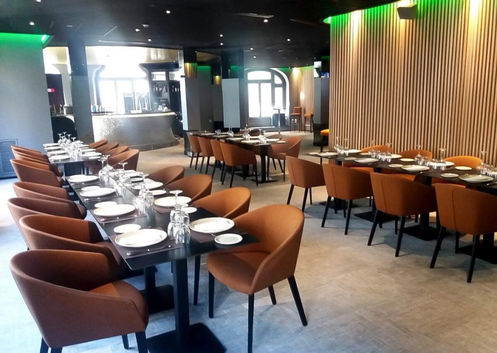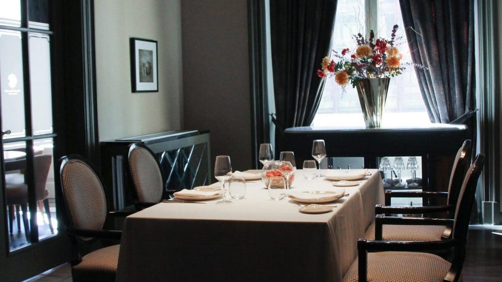 El restaurante principal del casino ocupa la segunda planta del edificio histórico, con vistas directas a la Gran Vía. La cocina es mediterránea de mercado: productos ibéricos, pescados seleccionados, carnes de calidad y una carta que combina tradición española con propuestas más contemporáneas.